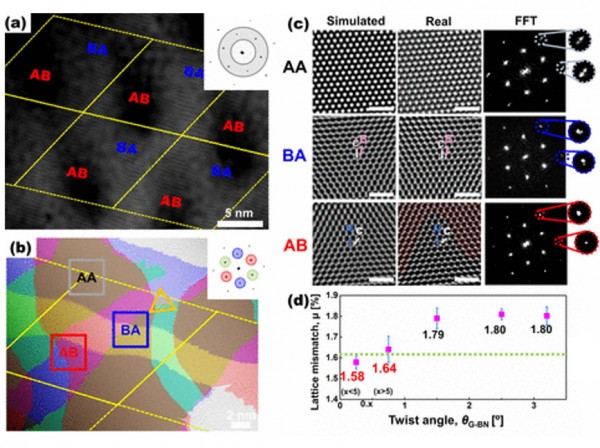 Transition to a commensurate state changes the local symmetry periodicity on two-dimensional van der Waals superstructures, evoking distinctive properties far beyond individual layers. We investigate the morphology of moiré superstructures of graphene on hexagonal boron nitride (hBN) with a low twist angle (≈0°) through moiré fringe analyses with dark field transmission electron microscopy. The moiré fringes exhibit local variation, suggesting that the interaction between graphene and hBN depends on the stacking configuration and that local transition to the commensurate state occurs through the reduced crystalline mismatch (that is, by lattice stretching and twisting on the graphene lattices). This moiré superstructure analysis suggests an inventive method for studying the interaction between stacked van der Waals layers and for discerning the altered electronic and optical properties of graphene on hBN superstructures with a low twist angle, even at low magnification.